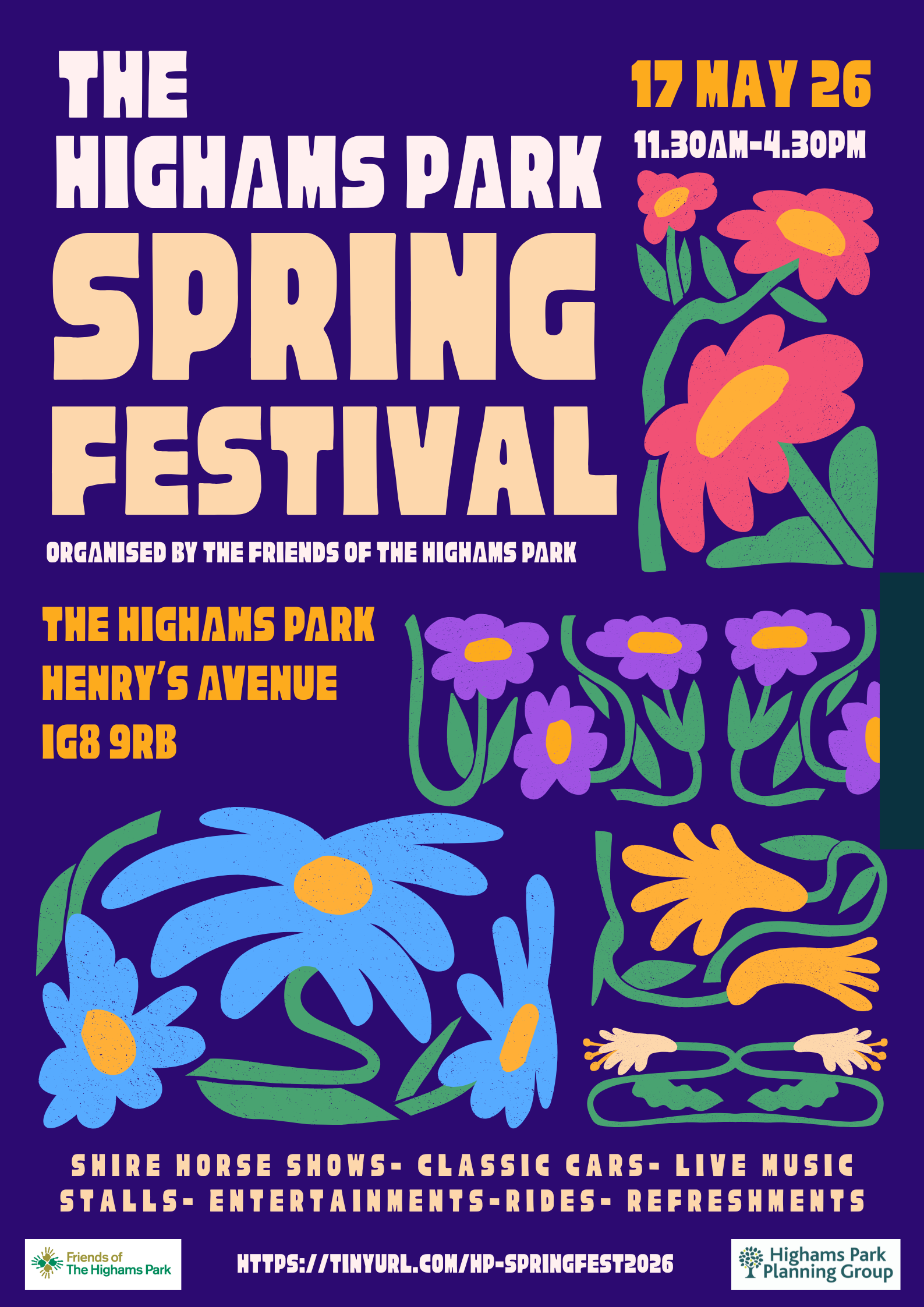 This year’s Spring Festival will be from 11.30 am until 4.30pm on Sunday 17th May and will be a free to attend family fun day in The Highams Park IG8 9RB (near to Highams Park Lake) .