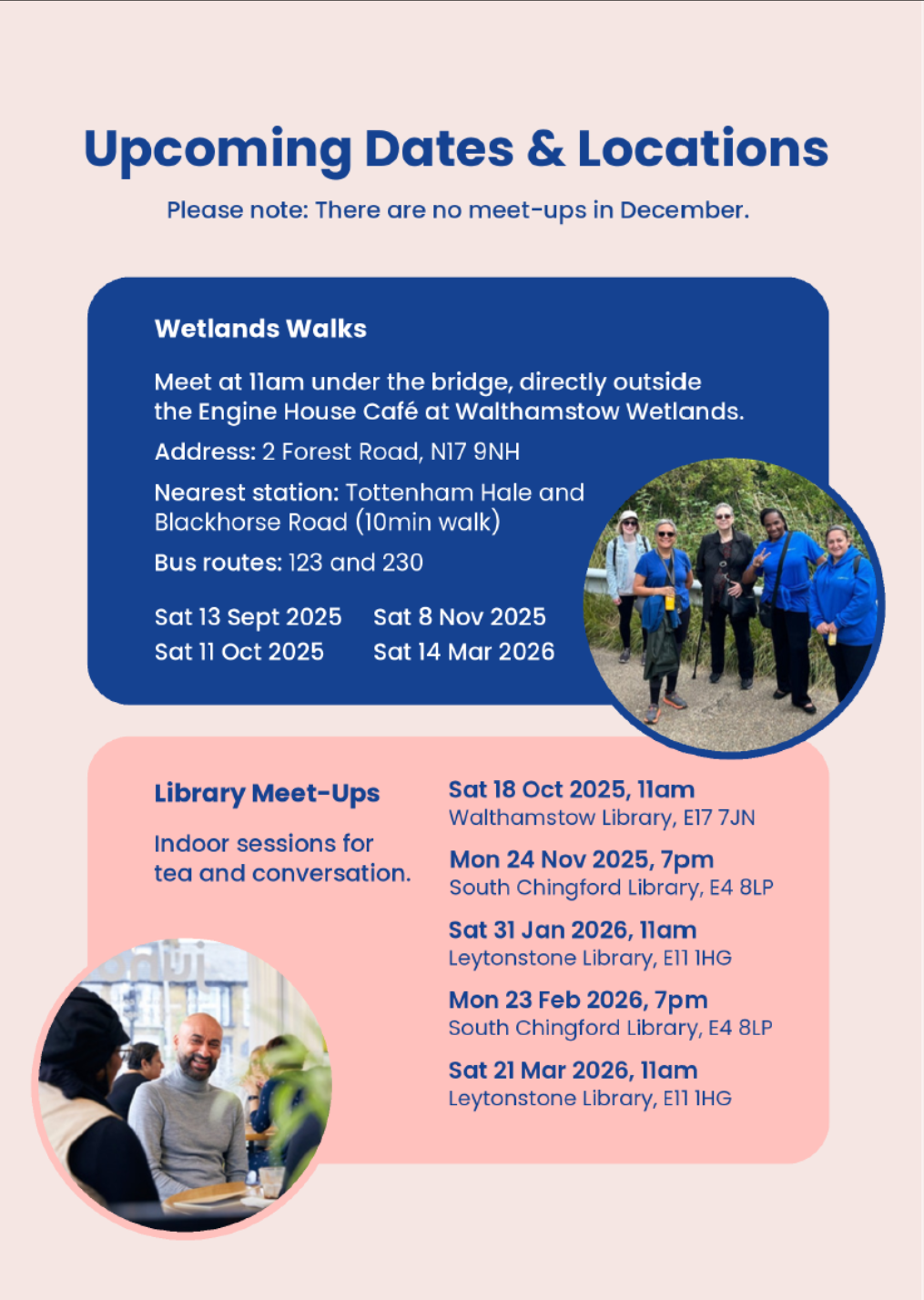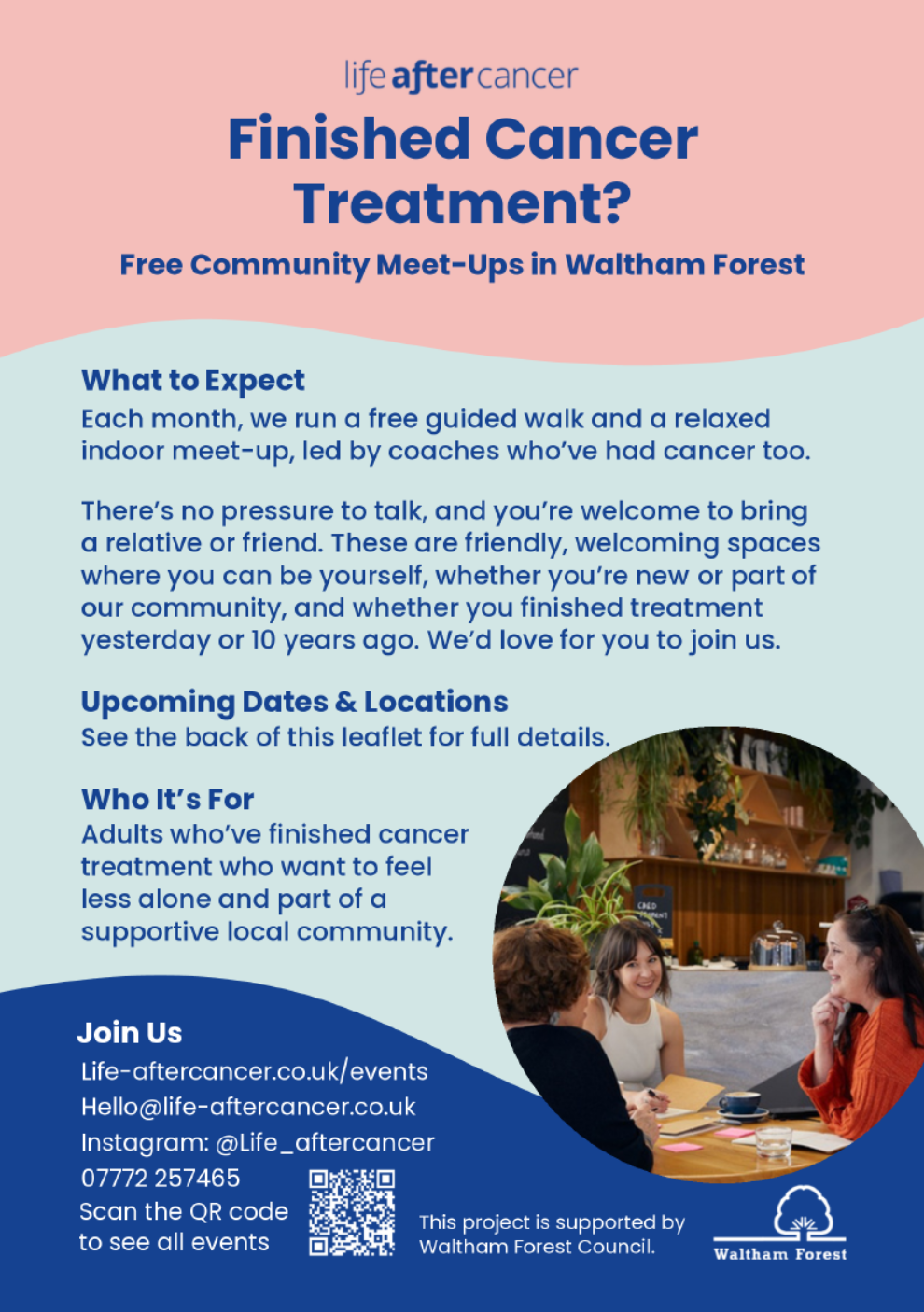 Life after Cancer is a not-for-profit organisation in Waltham Forest, offering free support for adults who’ve finished cancer treatment. Each month, from now until March 2026 there is a free guided walk and a relaxed indoor meet-up, led by a trained coach who has also had cancer. This is for you if you want to feel less alone and part of a local supportive community. Life after cancer welcomes you whether you finished cancer treatment yesterday or 10 years ago.
